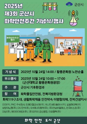[뉴스노크=김인호 기자] ‘화학사고 없는 안전도시 군산’ 실현을 위해 오는 10월 20일부터 24일까지‘제3회 군산시 화학안전주간’행사가 열린다.