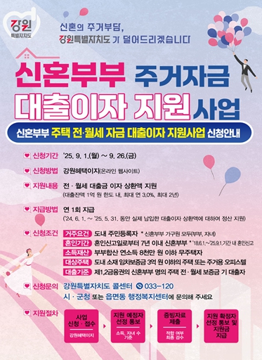[뉴스노크=김인호 기자] 강원특별자치도는 오는 9월 26일까지 '신혼부부 주거자금 대출이자 지원사업' 대상자를 추가 모집한다고 밝혔다.