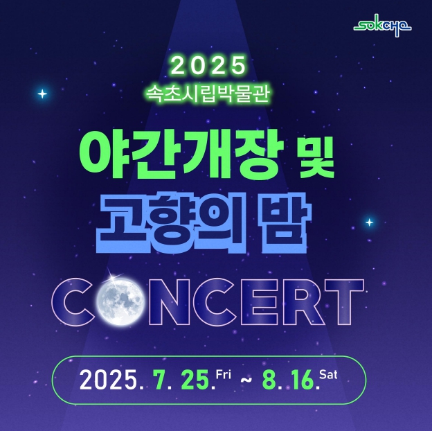 이병선 속초시장은 “설악산에서 불어오는 시원한 밤공기 속에서 즐기는 야간 공연은 시민과 관광객 모두에게 여름밤의 색다른 휴식과 감동을 선사할 것”이라며 “많은 분이 야간에도 속초시립박물관을 방문해 전시와 공연을 함께 즐기길 바란다”라고 밝혔다.