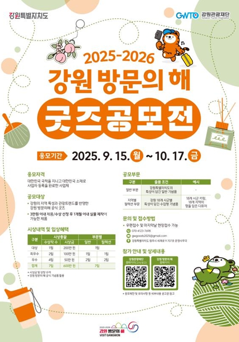 [뉴스노크=김인호 기자] 강원특별자치도와 강원관광재단은 ‘2025-2026 강원 방문의 해’를 기념하여 독창적인 관광 기념품을 발굴하기 위한 ‘굿즈 공모전’을 개최한다.