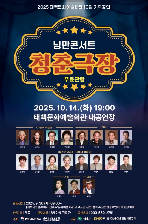 '2025 낭만콘서트 청춘극장'은 문화체육관광부와 한국콘텐츠진흥원에서 주최 및 지원하며 (사)한국방송예술인단체연합회와 태백시가 주관하는 공연이다.