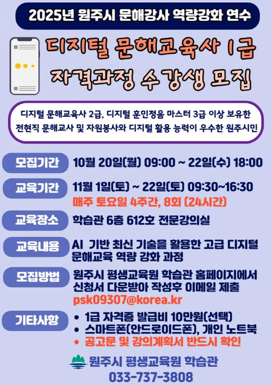 이번 강좌는 4주간 진행되며, 전·현직 문해강사와 자원봉사자 및 디지털 활용 능력이 우수한 원주시민 20명을 대상으로 한다. 인공지능(AI) 기반 디지털 활용 능력 강화와 ‘디지털 문해교육사 1급 자격과정’을 병행해, 교사들의 현장 적용 능력을 높일 예정이다.