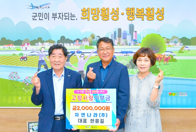[뉴스노크=김인호 기자] 횡성군은 지난 24일 자연나라(주) 한윤길 대표가 고향사랑기부금 2백만원을 기부했다고 밝혔다.