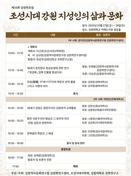 [뉴스노크=김인호 기자] 강원역사문화연구원 강원학연구센터는 2025년 10월 17일 오후 1시, 강원대학교 미래도서관 정강홀에서 제16회 강원학포럼 ‘조선시대 강원 지성인의 삶과 문화’를 조선시대사학회·강원대학교 국학연구소와 공동으로 개최한다.