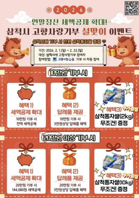 [뉴스노크=김인호 기자] 삼척시는 2026년 고향사랑기부제 세액공제 혜택 확대를 기념해 설 명절을 맞아 '삼척시 고향사랑기부제 설맞이 이벤트'를 진행한다.