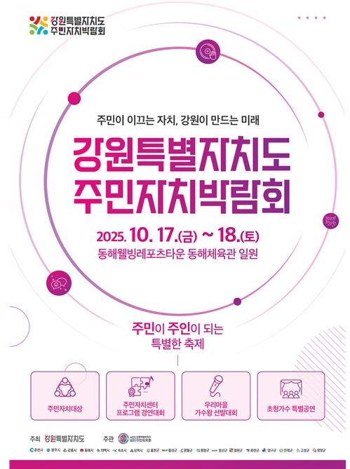 [뉴스노크=김인호 기자] 강원특별자치도는 10월 17일부터 18일까지 동해시 동해체육관 일원에서 '2025 강원특별자치도 주민자치박람회'를 개최한다고 밝혔다.
