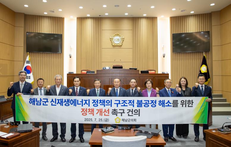 [뉴스노크=김인호 기자] 해남군의회는 지난 25일 열린 제345회 임시회에서 서해근 의원이 대표 발의한 '해남군 신재생에너지 정책의 구조적 불공정 해소를 위한 정책 개선 촉구 건의안'을 채택하고, 신재생에너지 발전의 혜택이 지역민에게 실질적으로 돌아갈 수 있도록 제도 개선을 정부와 한국전력공사에 강력히 촉구했다.