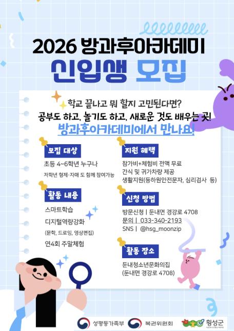 [뉴스노크=김인호 기자] 횡성군 둔내청소년문화의집이 지역 청소년의 균형 있는 성장을 돕기 위한 ‘2026년 방과후아카데미’ 신입생을 모집한다.