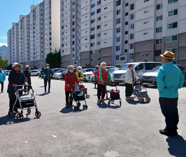 | ▲ 어르신들이 아파트 단지 앞에 모여 걷기 운동 시작 전 준비운동을 하고 있다 |