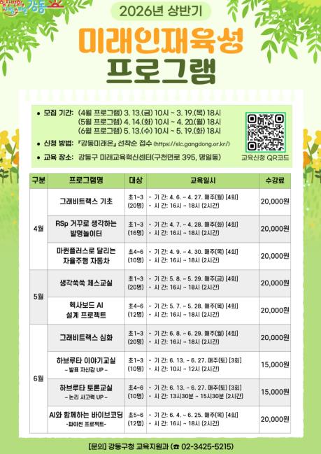 이번 프로그램은 4월 6일부터 6월 29일까지 강동구 미래교육혁신센터(구천면로 395, 명일동)에서 관내 초등학생 130명을 대상으로 실시된다. 인공지능(AI), 발명과학, 사고력 분야를 중심으로 한 체험·실습형 교육과정 9개로 구성되며, 학생들이 직접 참여하고 배우는 활동 중심 수업으로 진행된다.