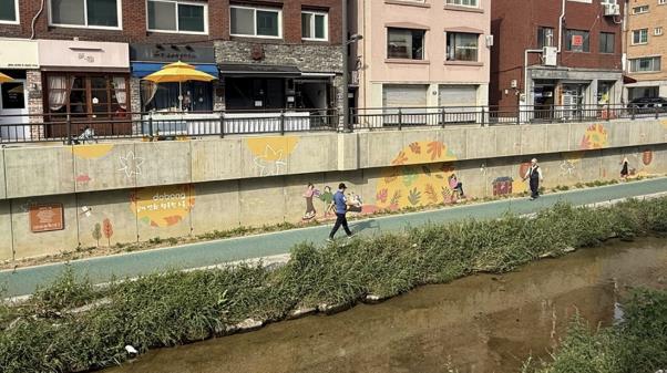 [뉴스노크=김인호 기자] 방학천(금강아미움 맞은편~방학교) 옹벽 약 360m 구간이 걷고 싶고 머무르고 싶은 산책길로 탈바꿈했다.