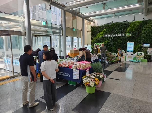 ▲ 수원시가 3일 수원시청 별관 로비에서 ‘시민에게 찾아가는 직거래 장터’를 운영하고 있다. |