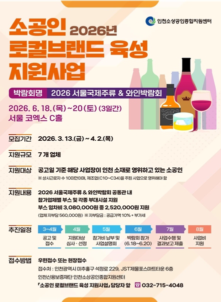 특히 2026년 6월 개최 예정인 ‘서울국제주류·와인박람회’에서 인천 소공인 공동관을 운영해 지역 소공인의 제품을 공동으로 홍보한다.