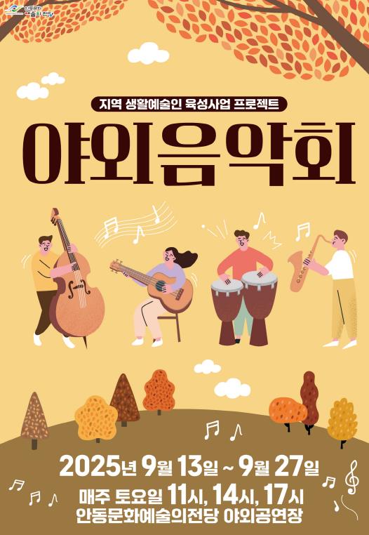 [뉴스노크=김인호 기자] 안동문화예술의전당은 오는 9월 13일을 시작으로, 3주간에 걸쳐 지역 생활예술인 육성지원 사업 ‘2025년 안동문화예술의전당 야외음악회’를 안동문화예술의전당 야외공연장에서 무료로 개최한다.