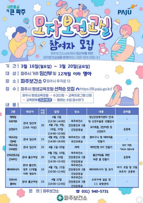 [뉴스노크=김인호 기자] 파주보건소는 건강한 임신과 출산, 행복한 육아를 지원하기 위해 4월부터 운영하는 ‘모자보건 프로그램’참여자를 모집한다.