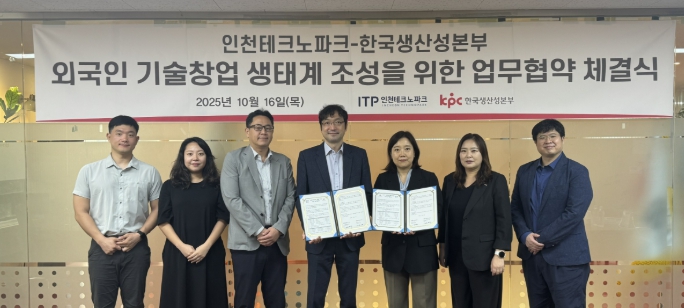 [뉴스노크=김인호 기자] 인천테크노파크는 지난 16일 한국생산성본부와 ‘외국인 창업 활성화 및 창업 생태계 조성을 위한 업무협약(MOU)’을 체결했다.