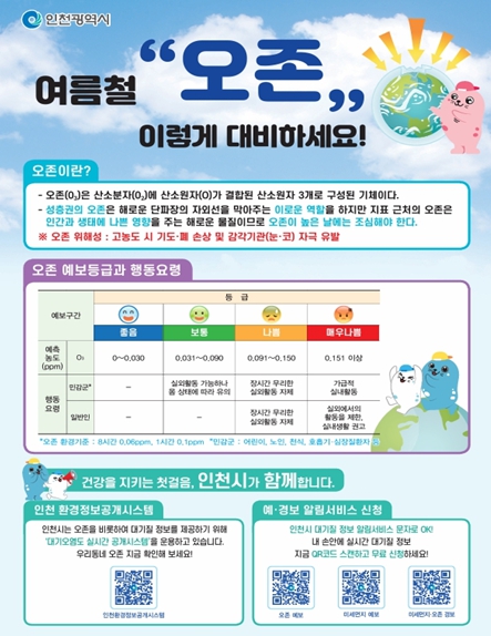 인천시는 오존 예‧경보의 신속한 전파를 위해 ‘예보 알림톡’과 ‘경보 발령 알림’ 문자 서비스를 운영하고 있으며, 고농도 오존이 발생할 경우 농도에 따라 주의보(0.12ppm 이상), 경보(0.3ppm 이상), 중대경보(0.5ppm 이상) 3단계로 오존 경보를 발령하고 있다.