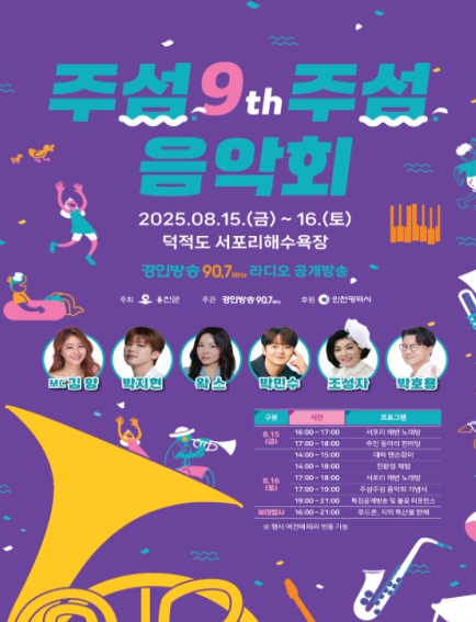 올해로 아홉 번째를 맞이하는 ‘주섬주섬 음악회’는 옹진군이 주최하고 경인방송이 주관하는 인천을 대표하는 여름 해수욕장 음악회로, 8월 15일부터 16일까지 지역 주민과 관광객들에게 덕적도만의 낭만적인 여름밤을 선사한다.