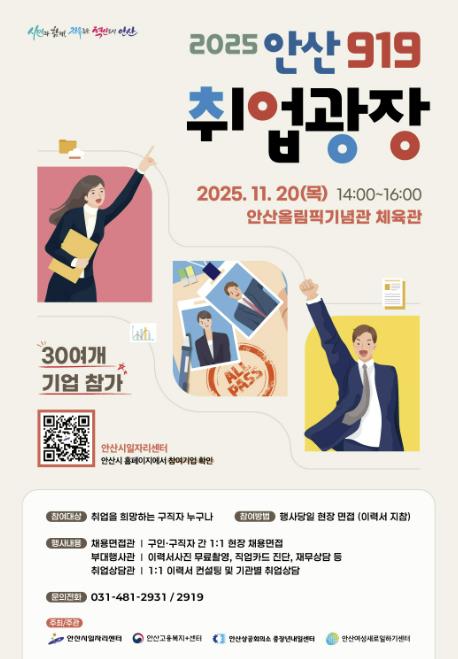 [뉴스노크=김인호 기자] 안산시는 오는 20일 ‘2025년 11월 안산 919취업광장’을 안산올림픽기념관 체육관에서 개최한다고 5일 밝혔다.