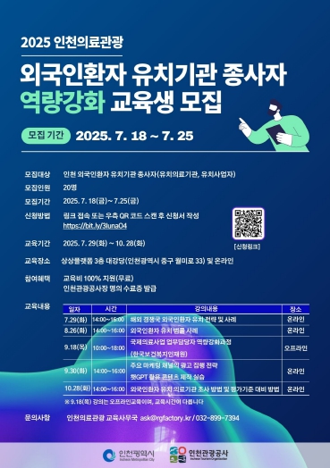 [뉴스노크=김인호 기자] 인천광역시와 인천관광공사는 지역 의료관광 산업의 경쟁력 강화하기 위해 '2025년 인천 의료관광 전문 인력 육성 교육'을 실시한다고 29일 밝혔다.