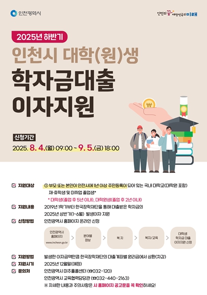 [뉴스노크=김인호 기자] 인천광역시는 대학(원)생들의 학자금대출 부담을 줄이기 위해 2025년 하반기 학자금대출 이자 지원신청을 오는 8월 4일부터 접수한다고 밝혔다.