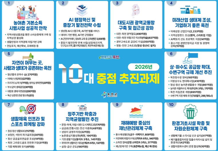 [뉴스노크=김인호 기자] 옥천군이 26일 2026년 군정 운영의 핵심 방향을 담은 10대 중점 추진과제를 발표하고, 군민 삶의 질 향상과 지속가능한 지역성장을 위한 정책 추진에 나선다.
