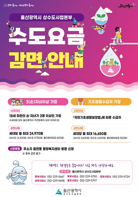 [뉴스노크=김인호 기자] 울산시 상수도사업본부는 지난해에 이어 올해도 관내 3자녀(손자녀 포함) 이상 가정 및 기초생활수급자를 대상으로 상·하수도 요금 감면 혜택을 지원한다고 밝혔다.