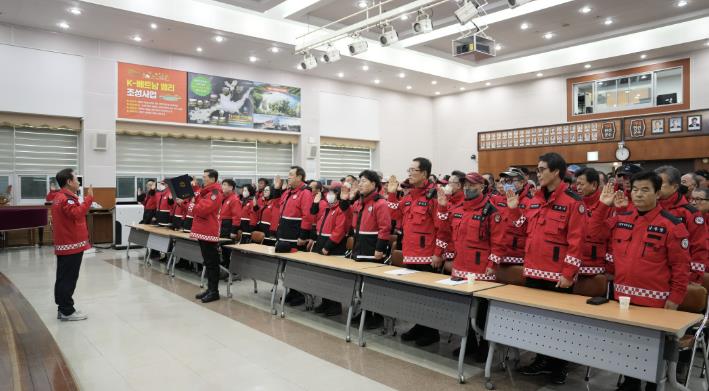 행사는 산림재난대응단 대표자의 산불 예방 결의 선서를 시작으로, 안전한 산불 진화 활동과 체계적인 산불 예방·홍보 추진을 위한 산불감시대 직무 교육 순으로 진행됐다.