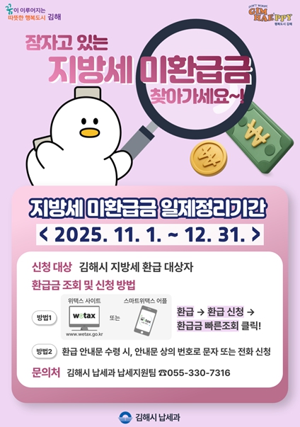 [뉴스노크=김인호 기자] 김해시는 납세자가 돌려받을 지방세 환급금을 제때 찾아갈 수 있도록 11~12월 ‘2025 지방세 미환급금 일제정리 기간’을 운영한다고 31일 밝혔다.