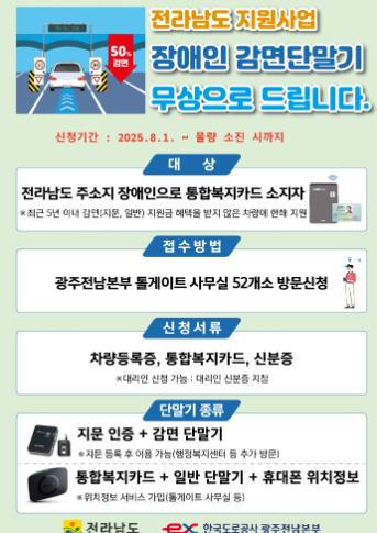 현재 전남도는 전국 최초로 한국도로공사 광주전남본부와 협업해 2015년부터 장애인용 고속도로 하이패스 단말기 무상 지원 사업을 시작했으며, 지난해까지 총 1만 1천415대를 지원했다.
