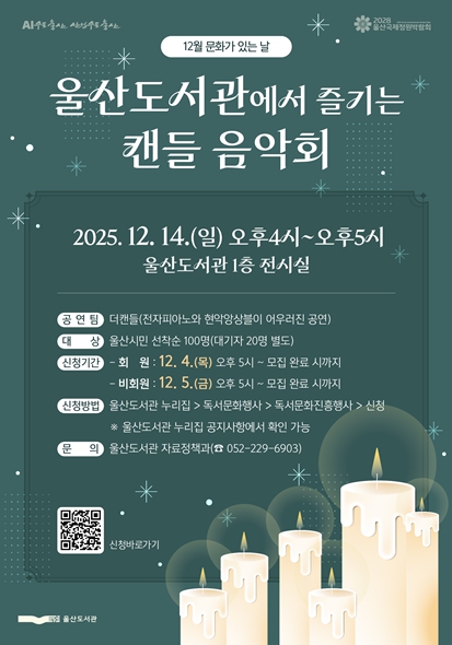 [뉴스노크=김인호 기자] 울산도서관은 12월 문화가 있는 날을 맞아 오는 12월 14일 ‘겨울 도서관 양초(캔들) 음악회’를 개최한다고 밝혔다.