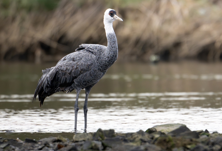 흑두루미는 두루미과로 소형 두루미류다. 이마가 검은색이며 정수리 앞부분에 붉은색 피부가 노출돼 있다. 머리와 목 윗부분은 흰색이며 몸 전체는 회흑색이다.