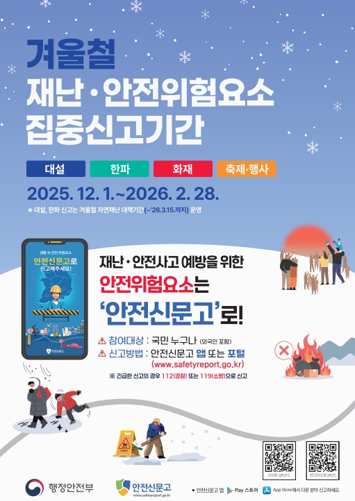 이번 기간에는 겨울철에 발생 가능성이 높은 ▲대설 ▲ 한파 ▲화재 ▲축제·행사 등 4가지 유형의 위험 요소를 대상으로 시민이 직접 신고할 수 있다.