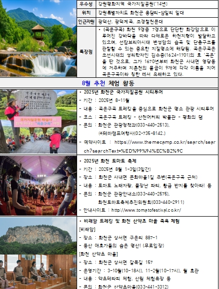 8월에는 곡운구곡을 중심으로 다양한 여름 프로그램이 운영된다.