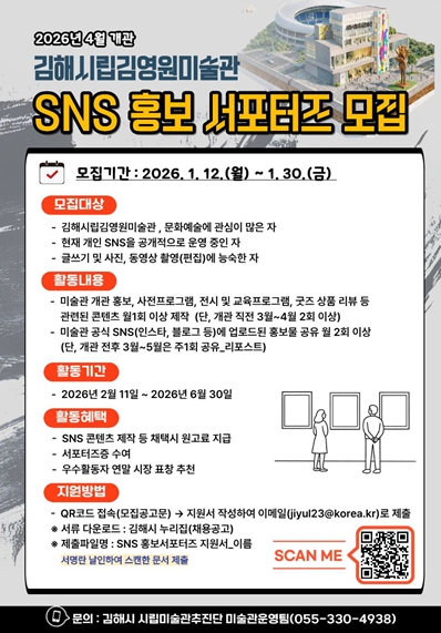 [뉴스노크=김인호 기자] 김해시는 오는 2026년 4월 개관 예정인 ‘김해시립김영원미술관’을 알리고, 미술관의 개관 과정을 생생하게 기록하고 홍보할 'SNS 홍보 서포터즈'를 모집한다고 밝혔다.