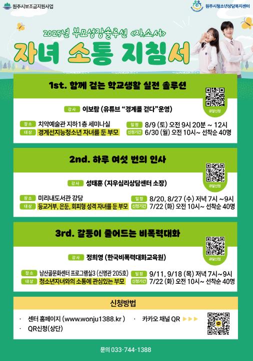 교육은 안내문의 큐알(QR)코드 또는 원주시청소년상담복지센터 카카오톡 채널, 홈페이지를 통해 신청할 수 있다. 교육 별로 40명의 부모 참가자를 모집한다.