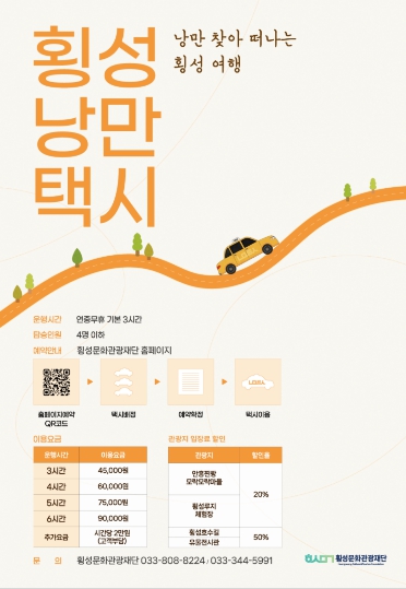 한편, 낭만택시 이용 방법과 상세한 할인 일정은 향후 횡성문화관광재단 누리집(홈페이지)을 통해 공지될 예정이다.