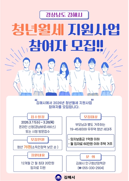 [뉴스노크=김인호 기자] 김해시는 오는 11일부터 26일까지 월 최대 20만원, 12개월간 지원하는 '2026년 김해시 청년 월세 지원사업‘ 참여자 76명을 모집한다고 4일 밝혔다.