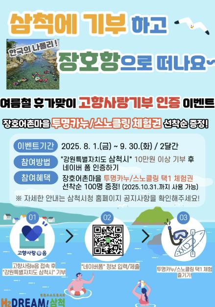 이번 이벤트는 이벤트 기간 내 삼척시에 10만 원 이상 기부하고, 네이버폼을 통해 기부 인증을 완료한 선착순 100명에게 장호어촌체험마을 투명카누(4인승) 또는 스노클링(2인) 체험권 1매를 모바일티켓 형태로 제공하는 행사다.
