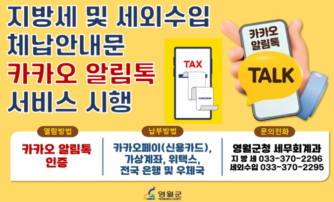[뉴스노크=김인호 기자] 영월군은 납세자의 편의 향상과 체납 안내의 효율성을 높이기 위해 8월부터 '지방세 및 세외수입 체납안내문'을 카카오 알림톡으로 발송하는 서비스를 본격 시행한다고 밝혔다.