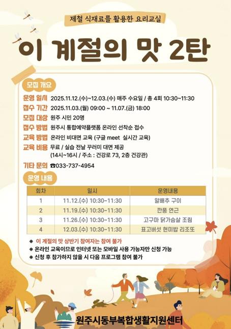 [뉴스노크=김인호 기자] 원주시 동부복합생활지원센터는 오는 11월 3일부터 ‘이 계절의 맛 2탄’ 건강 요리 교실 프로그램 참여자를 모집한다.