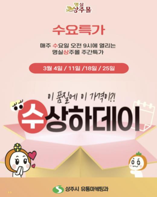 [뉴스노크=김인호 기자] 상주시는 지역 농특산물의 온라인 판로 확대와 소비 촉진을 위해 상주시 농특산물 공식 쇼핑몰 ‘명실상주몰’에서 3월부터 11월까지 매주 수요일 ‘수요특가 수상하데이’행사를 운영한다.