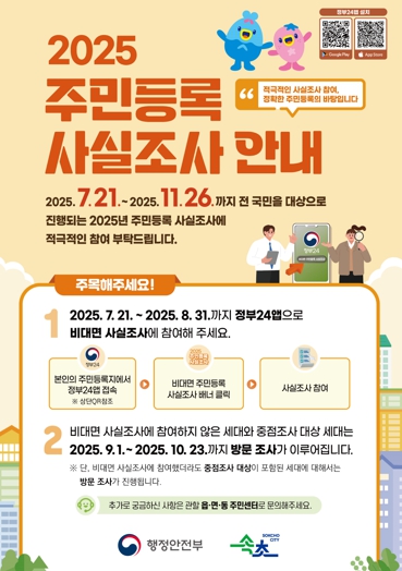 [뉴스노크=김인호 기자] 속초시는 주민등록정보의 정확성을 높이고 공정한 행정·복지 서비스를 제공하기 위해 7월 21일부터 11월 26일까지 ‘2025년 주민등록 사실조사’를 실시한다.