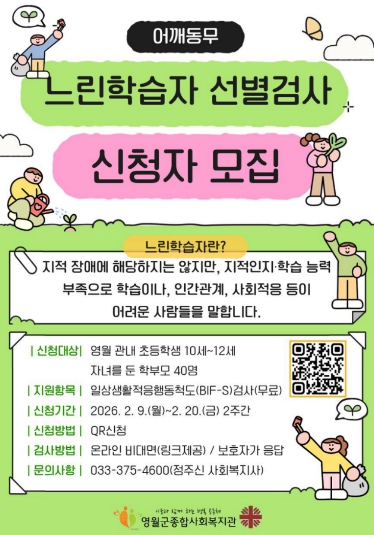 영월군종합사회복지관 2026년 ‘느린학습자 선별검사’ 신청자 모집