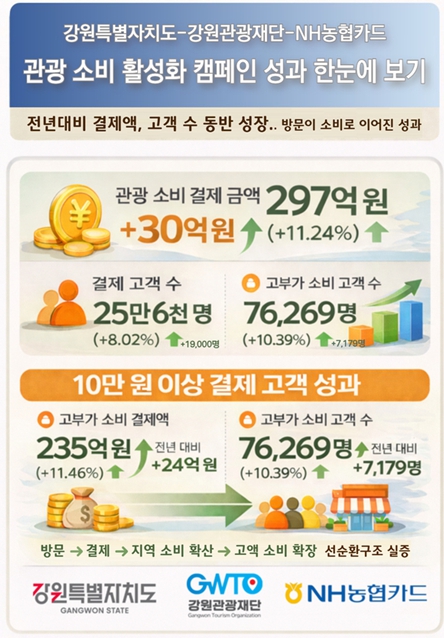 [뉴스노크=김인호 기자] 강원특별자치도와 강원관광재단은 NH농협카드와 함께 추진한 ‘강원 관광소비 활성화 상생 캠페인’ 결과, 전년 동일 기간 대비 관광 소비 금액과 결제 고객 수가 모두 증가하며 실질적인 지역 소비 활성화 성과를 거둔 것으로 나타났다.