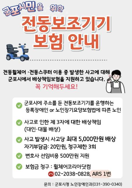 군포시장은 “이번 배상책임보험 지원을 통해 전동보조기기를 이용하는 장애인과 노인의 사고 부담을 줄이고, 사고로 피해를 입은 타인의 권리 보호에도 실질적인 도움이 될 것으로 기대한다”며 “앞으로도 장애인과 노인뿐 아니라 모든 시민이 안심하고 이동할 수 있는 도시 환경을 만들기 위해 노력하겠다”고 말했다.