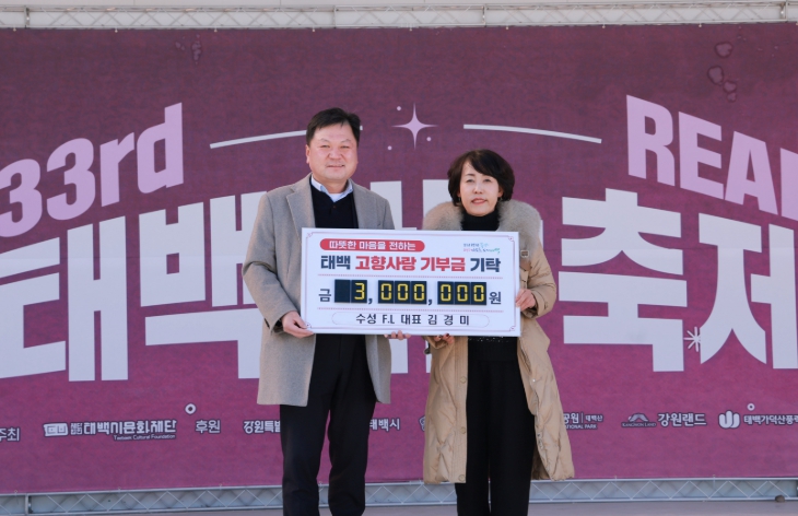 [뉴스노크=김인호 기자] 태백시는 2월 8일 태백산국립공원 당골광장에서 열린 제33회 태백산 눈축제 현장에서 태백 출신 기업인 김경미 수성 F.L 대표가 고향사랑기부금 300만 원을 기탁했다고 밝혔다.