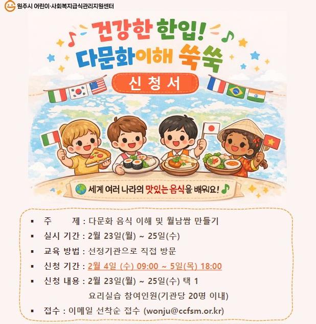 [뉴스노크=김인호 기자] 원주시어린이·사회복지급식관리지원센터는 오는 23일부터 25일까지 3일간 특화사업인 ‘쑥쑥 요리교실’을 운영한다.