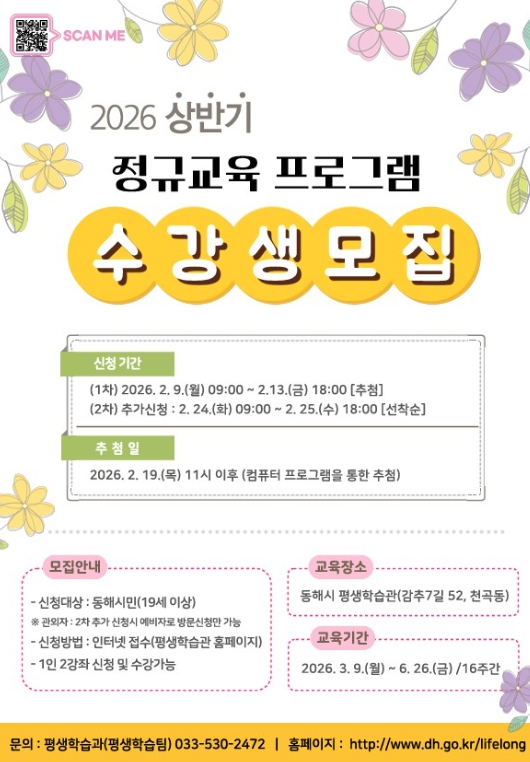 수강 신청은 2월 9일부터 2월 13일까지 동해시 평생학습관 홈페이지를 통한 인터넷 접수로 진행되며, 1인당 최대 2강좌까지 신청할 수 있다.