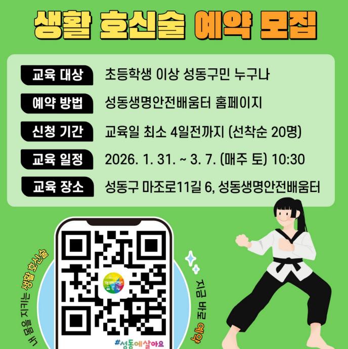 구는 성동생명안전배움터 누리집(홈페이지)을 통한 온라인 예약 시스템 운영으로 접근성을 높였으며, 호신술 전문 협회 강사진들이 실제 위기상황 시뮬레이션, 효과적인 자기방어법, 생활용품(가방, 휴대전화 등)을 이용한 호신술 등 실전을 중심으로 강의한다. 직접 참여하고 실습하는 체험형 교육 방식인 만큼, 초보자도 실생활에 바로 적용할 수 있다.